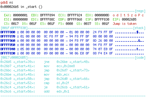 First one is about conditional jump display. Original gdbinit doesn’t tell you what will be the decision that will be taken on a conditional jump. You must look at the flags and check that! Well… I can’t memorize this kind of stuff (in reality I can but it’s useless so I refuse to) and computers were created to automate tasks! So I just added a nice Jump is taken or Jump is NOT taken (ripped from Ollydbg 😉) display!