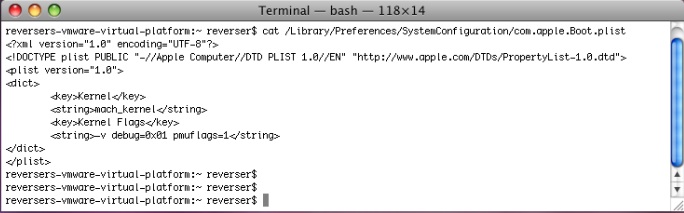Configure the virtual machine so we can attach the debugger to it. The Apple articles talk about changing NVRAM settings but thereās no such thing for VMware. There is another trick we can use! Edit the following text file, /Library/Preferences/SystemConfiguration/com.apple.Boot.plist. You can add our needed options at Kernel Flags key. Use the -v flag (for verbose output), pmuflags=1 (to avoid watchdog timer problems) and debug=0x1 (or other debug flags available, read the initial referred documents). I prefer to use the debug=0x1 flag because I couldnāt find a way to create NMI events inside the virtual machine. I want to do kernel debugging while itās running ok, not just when it crashes š. Example: