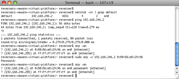 Insert a static arp entry for debugger machine IP in target machine. We are talking about VMware virtual networks. Check the following picture, you should be able to understand it š.. Take note of target machine IP address (open a Terminal.app and do a ifconfig en0, for example). This will be the IP address we are going to attach GDB from debugger machine.