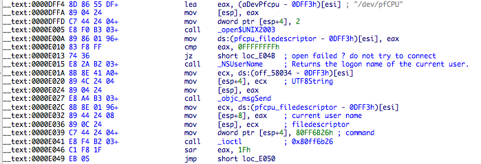 Let’s go back to the userland to demonstrate the first defect in this rootkit. The connection between userland and kernel is initialized by calling the method connectKext. This method sends the request 0x80FF6B26 to the /dev/pfCPU device, and the logon name of the current user as a parameter. Inside the kernel module, the name parameter is truncated to 20 bytes and passed as an argument to function backdoor_init. I did not reversed this function but it seems to use the username as an identifier.