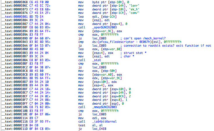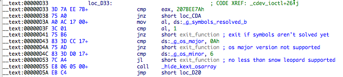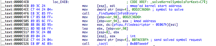 The ioctl request for 32 bit symbols is 0x807AEEBF and 0x807AEEC0 for 64 bit. One somewhat cute trick is happening here. IDA identified the prototype for rootkit cdev_ioctl function as: int __cdecl cdev_ioctl(int, int command, char *string, int, int). The third argument to ioctl is composed by the hash of the symbol to be solved (0xDD2C36D6 in this case) and the returned symbol address from _findSymbolInFatBinary. The trick is that all addresses of kernel symbols terminate with a null value, so this works. I find it cute.
