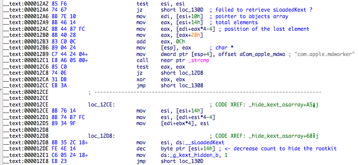 With a pointer to sLoadedKexts found it’s a matter of getting the array location inside OSArray class (16 bytes away from symbol address) and start searching for the com.apple.mdworker string. If it’s found than the total kext count is decreased!