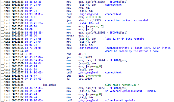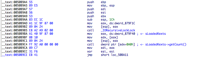 Crisis starts looking up for the first 0xE8 byte belonging to IORecursiveLockLock call so it can extract the address of sLoadedKexts. One curious thing here is that the symbol IORecursiveLockLock was solved by the userland module but it’s not used or stored inside the rootkit. It could assist in verifying that the right call was found (maybe something they were thinking about but forgot to implement).