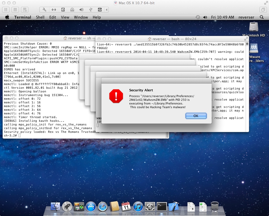 The kernel extension will generate a user alert when something wrong is detected, either on installation or already infected system. A message starting with [WARNING] will also be printed to the system log. The following screenshot demonstrates the execution and infection from the dropper in a Lion 10.7.5 system.