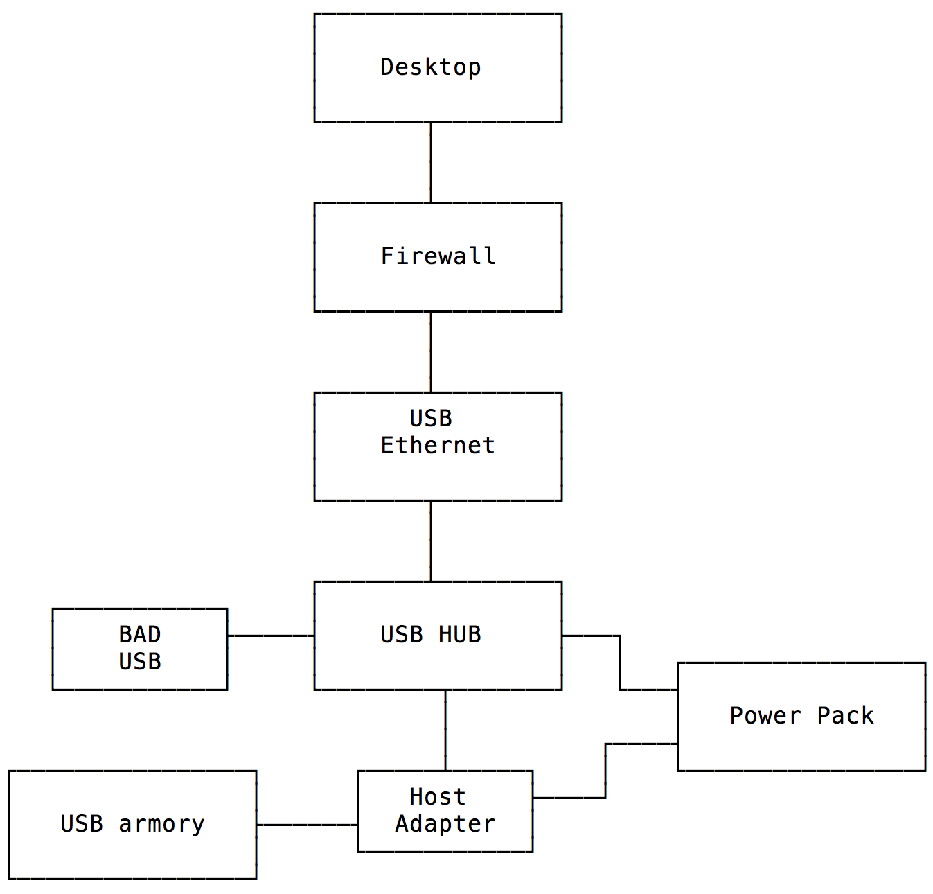 In this design a battery power pack is used to power everything but a self-powered USB hub is also ok if portability is not an issue. The USB armory host adapter can also work as a USB condom (only power lines are connected, data is blocked) meaning that we can safely power it from a normal USB port if necessary. The power pack can also power the USB or it might need extra power if connected devices are power hungry (big hard disks for example). The USB armory connects to one end of the host adapter, while the USB hub connects to the other end. Every other USB device is of course connected to the USB hub. The USB Ethernet adapter can be connected to the network where we want to copy data to, and to increase the air gap security a firewall can be set between the USB armory network and whatever network we want to access it from. Block everything but SSH and the air gap security just increases a notch (it now requires a malware that packs a zero day to bypass our firewall).