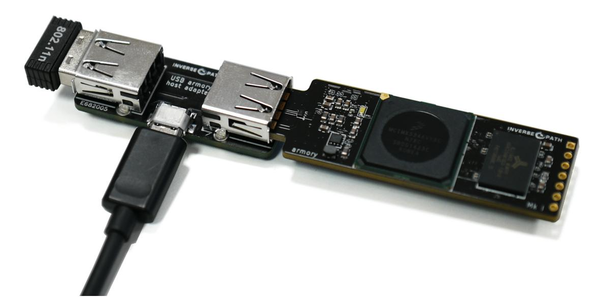 The USB armory is a small computer on a USB stick, providing an ARM A8 800 MHz CPU and 512MB RAM, and it’s versatile enough to implement all kinds of interesting scenarios. One of its most interesting features for this project is secure boot, called High Assurance Boot, that allows better integrity of our USB armory platform. Amusing enough, last week there was a security advisory regarding this feature. Assuming for now that no vulnerabilities exist in its secure boot, the USB armory is a very interesting platform to have a reasonable hardware integrity level because we can fuse our PKI keys into the secure boot and just replace the microSD card per analysis target. There aren’t a lot of vectors for targeted malware to achieve hardware persistency and make the device unusable from a forensics point of view (meaning a permanent rootkit that could taint our analysis forever). The device can be ordered from Inverse Path. For this project you also need to order an host adapter - without it we can’t implement this project.