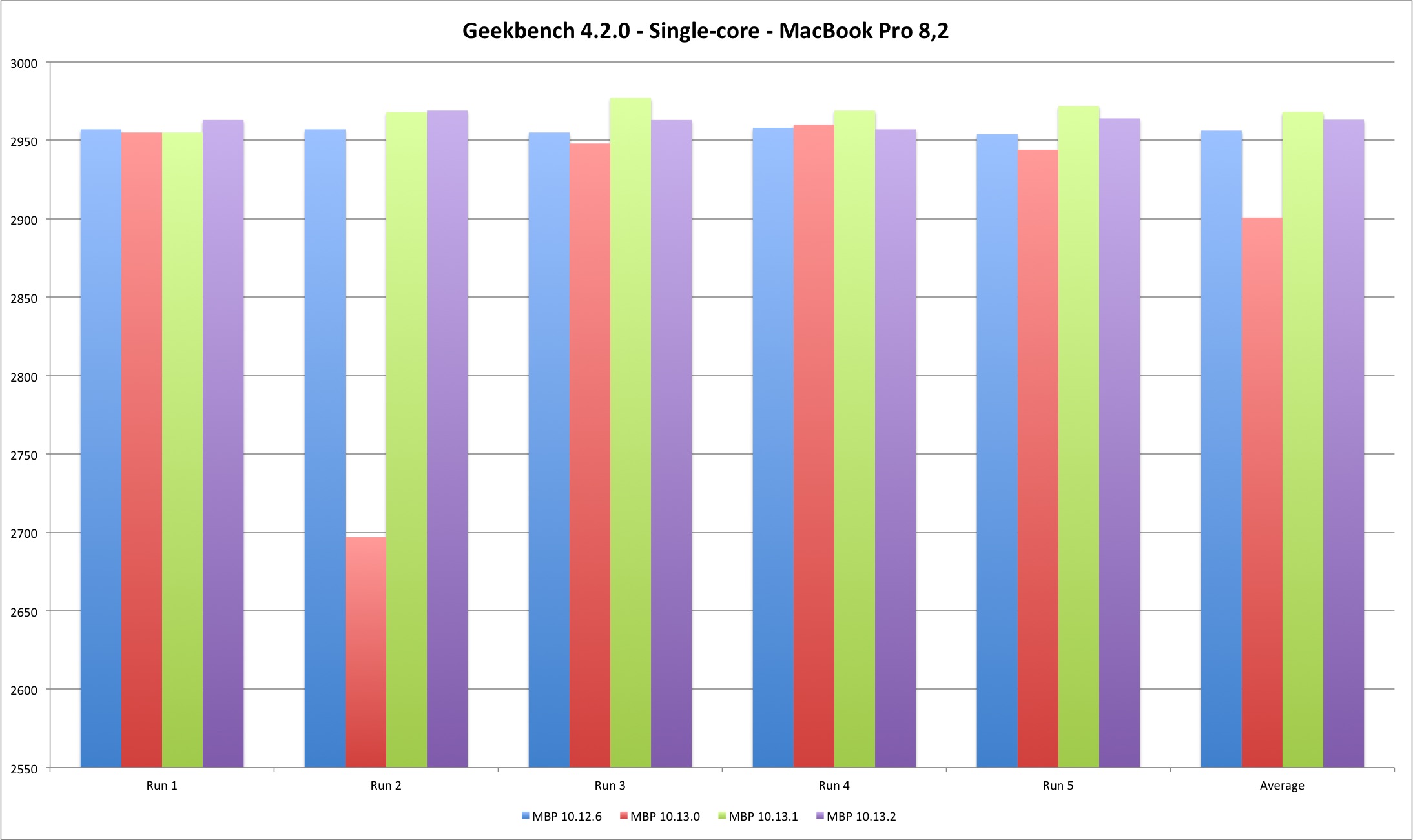 | Single Core | MBP 10.12.6 | MBP 10.13.0 | MBP 10.13.1 | MBP 10.13.2 |