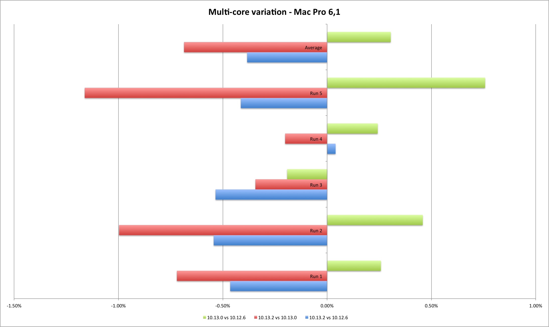 The MacBook Pro single core performance doesn’t vary much, except for those two outliers, both on 10.13.0. But the Mac Pro displays a different picture - the single core performance improved from Sierra to High Sierra. Between High Sierra versions there is no conclusive direction but the performance loss is minimal. The positive variation means that Geekbench scores improved with the new version, and negative that they got worse.