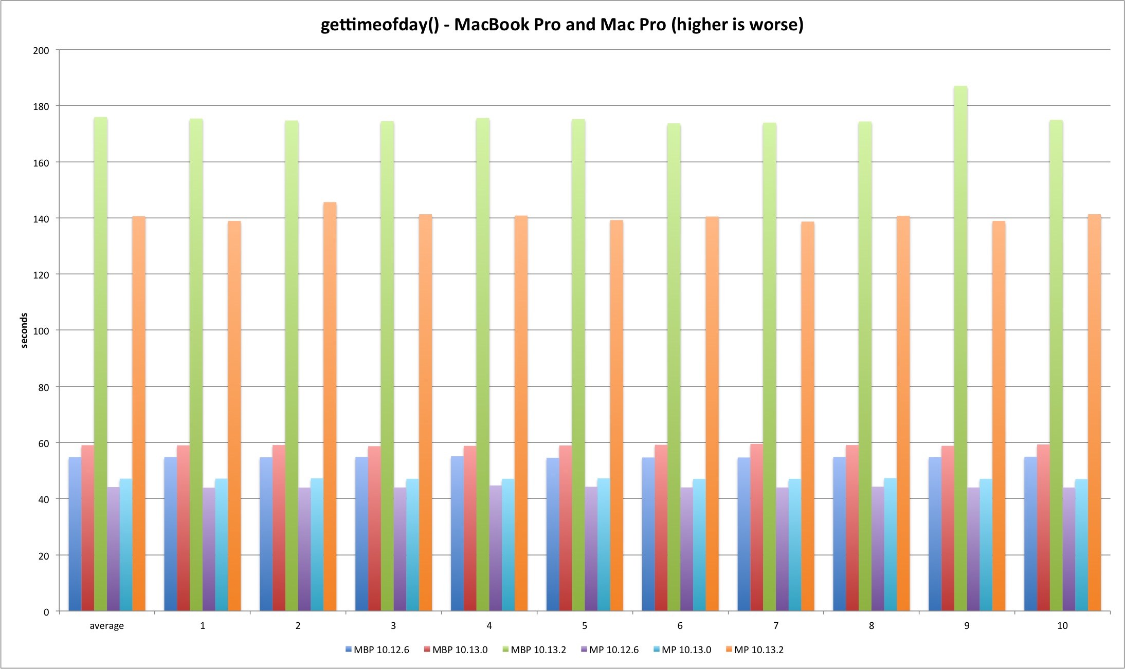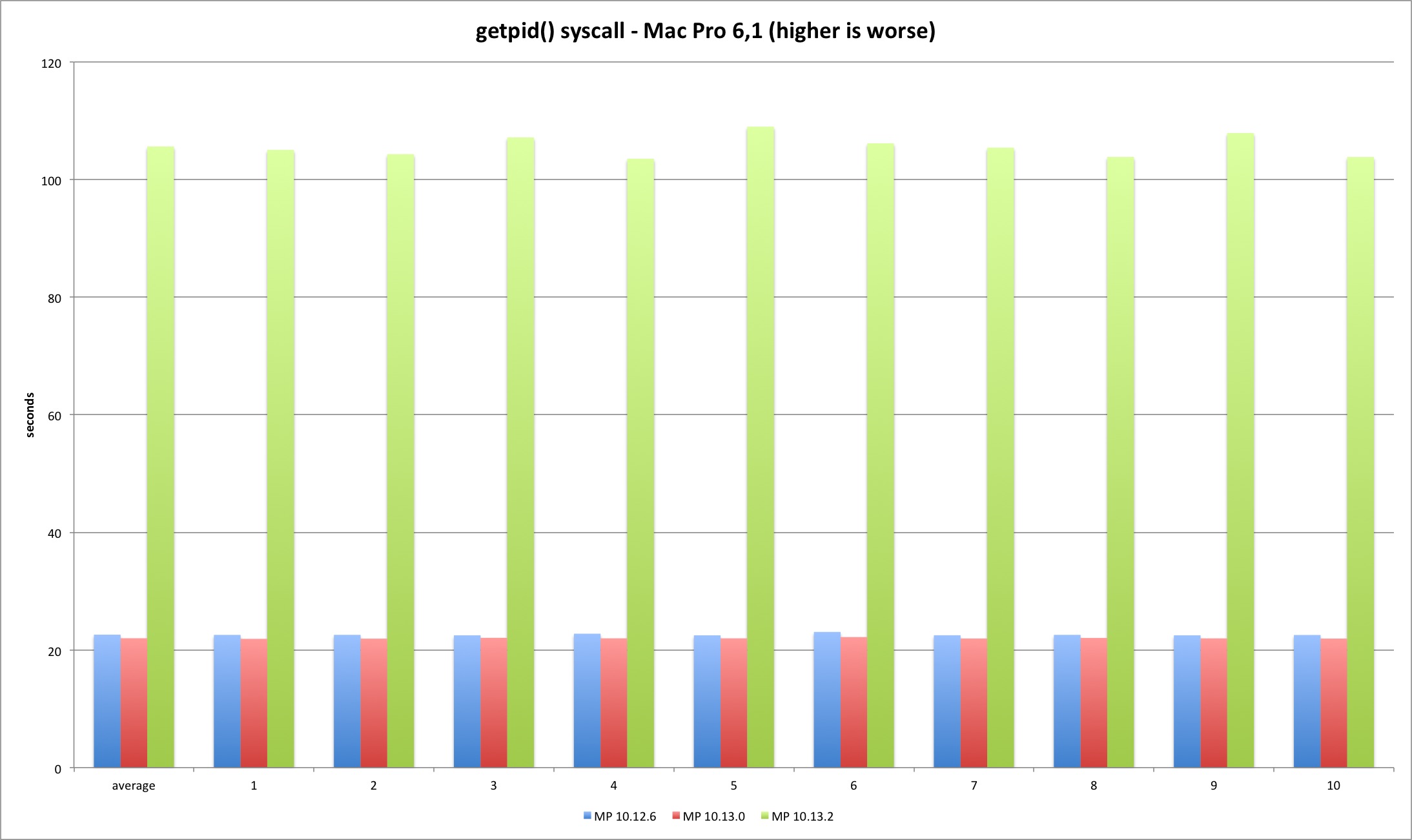 We can clearly observe this is where the fun starts. The 10.13.2 syscall is much slower versus previous versions. The fix introduces significant overhead at the syscall interface as expected. High Sierra 10.13.2 is more than 300% slower executing 250m getpid syscalls versus 10.13.0. Another test run executing only 50 million syscalls reveals the same variation - the performance loss is linear.