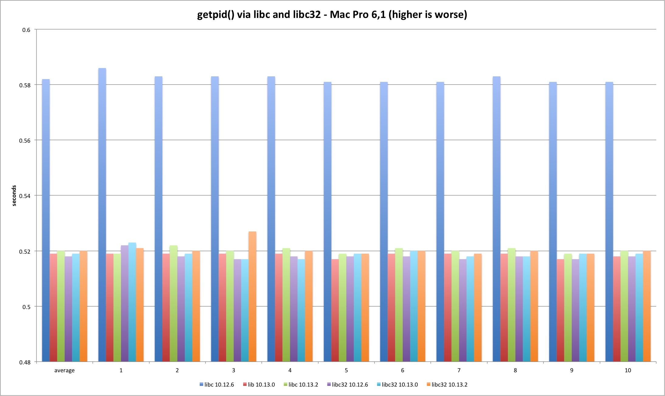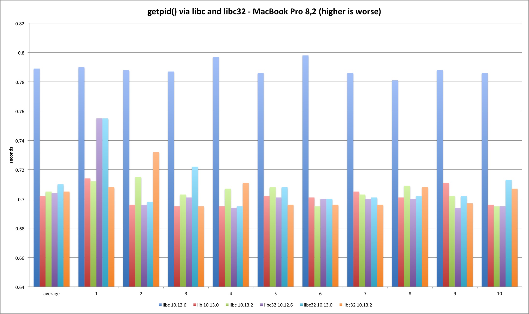 The results present an interesting detail. Somehow Sierra libc 64 bit binary has slightly higher overhead versus everything else. I have no idea why this is happening - the libsystem_kernel.dylib assembly code is exactly the same. We are talking about an irrelevant timing difference but it is still curious why both machines show the same pattern. It could be due to different process startup overhead since the test is very short.