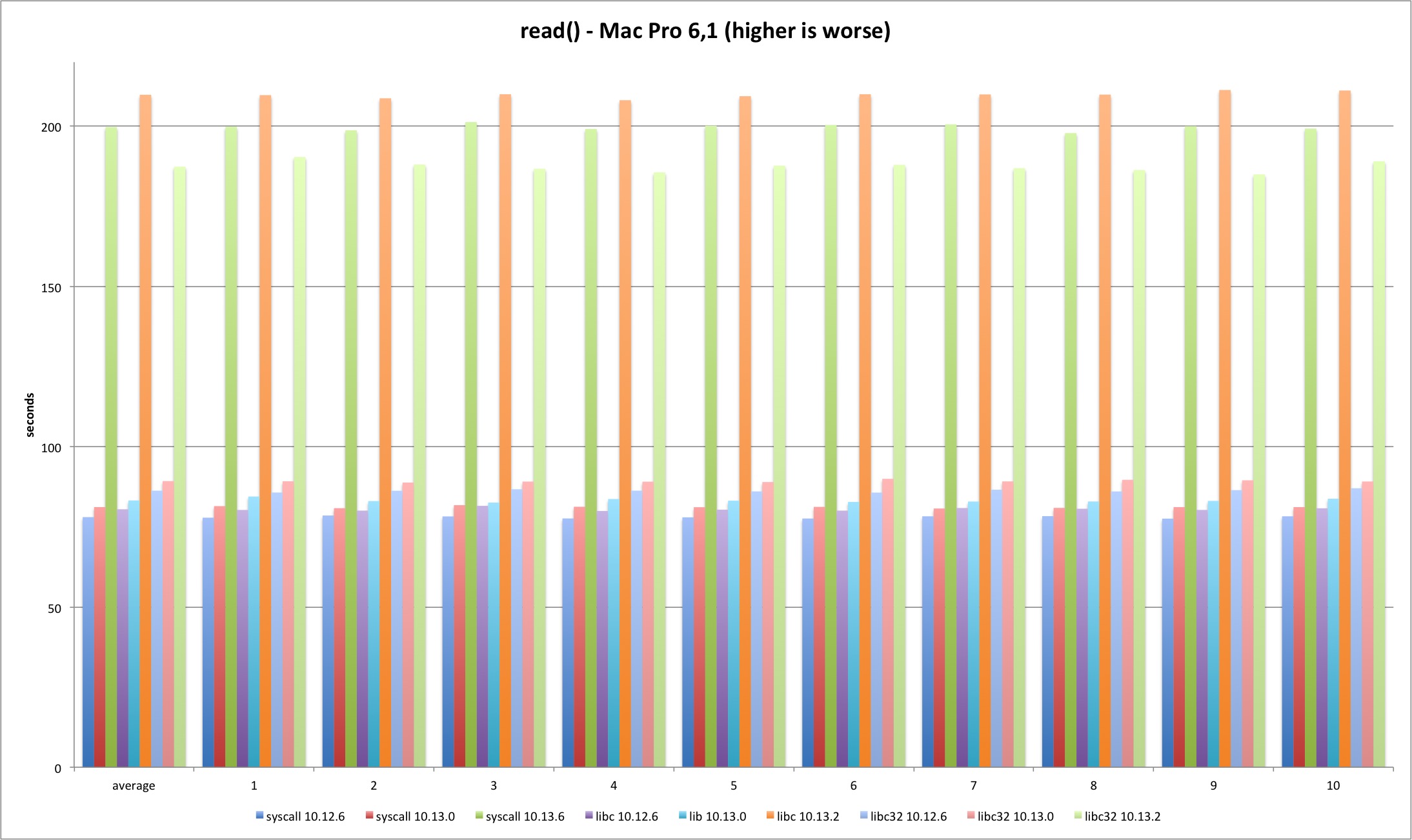 Next is the read syscall. The same loss pattern is observed on all tests although the loss is now around 140%. This time there is no visible improvement from Sierra to High Sierra (the test runs much longer so startup overhead is irrelevant). In 10.13.2 the 32 bits libc binary is faster than the other tests on both machines. Why?