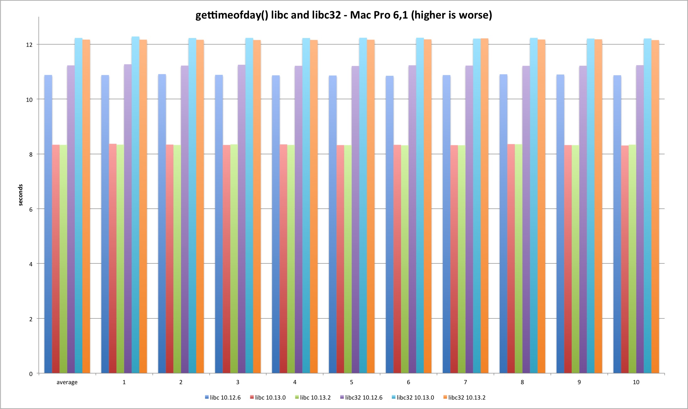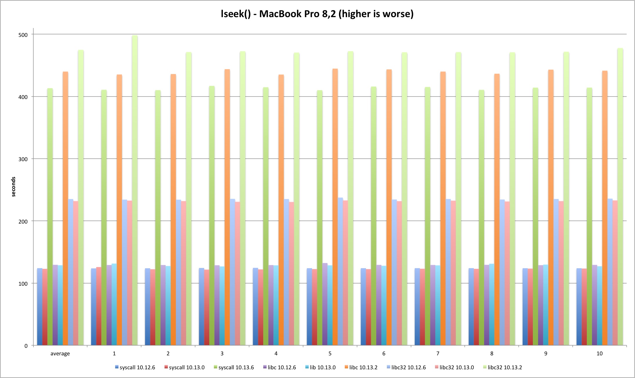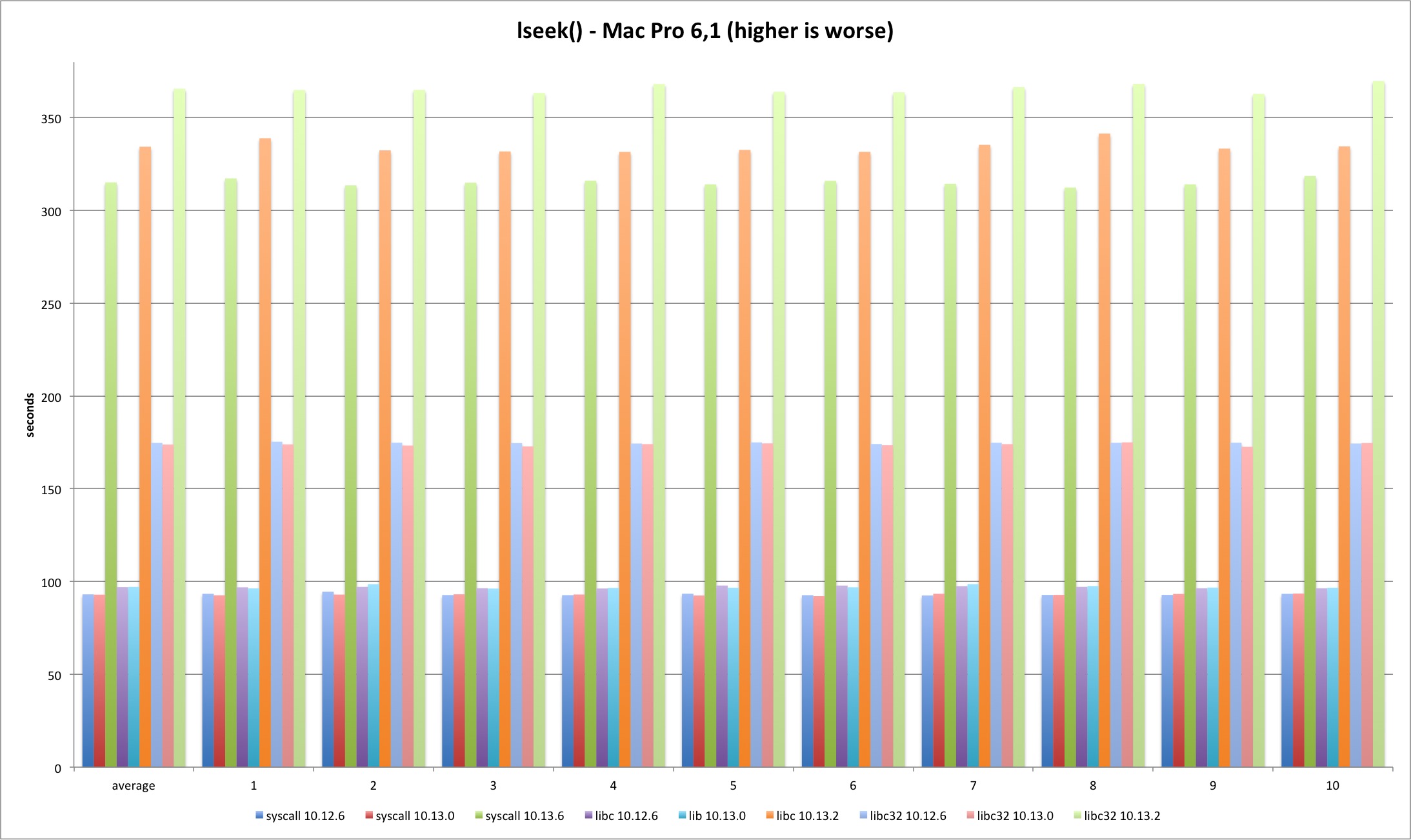 For the lseek test I decided to do two SEEK_SET per test, one 4 bytes ahead and then reset back to zero. The pattern holds and 10.13.2 test times are much longer, more than 200%. The difference is smaller in 32 bits because it was already 50% slower than 64 bit and syscall versions.
