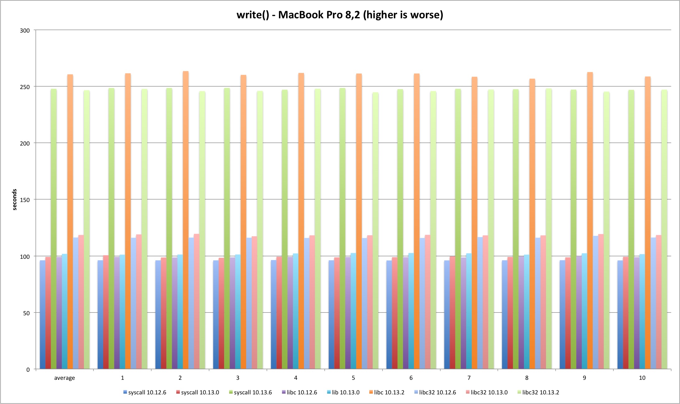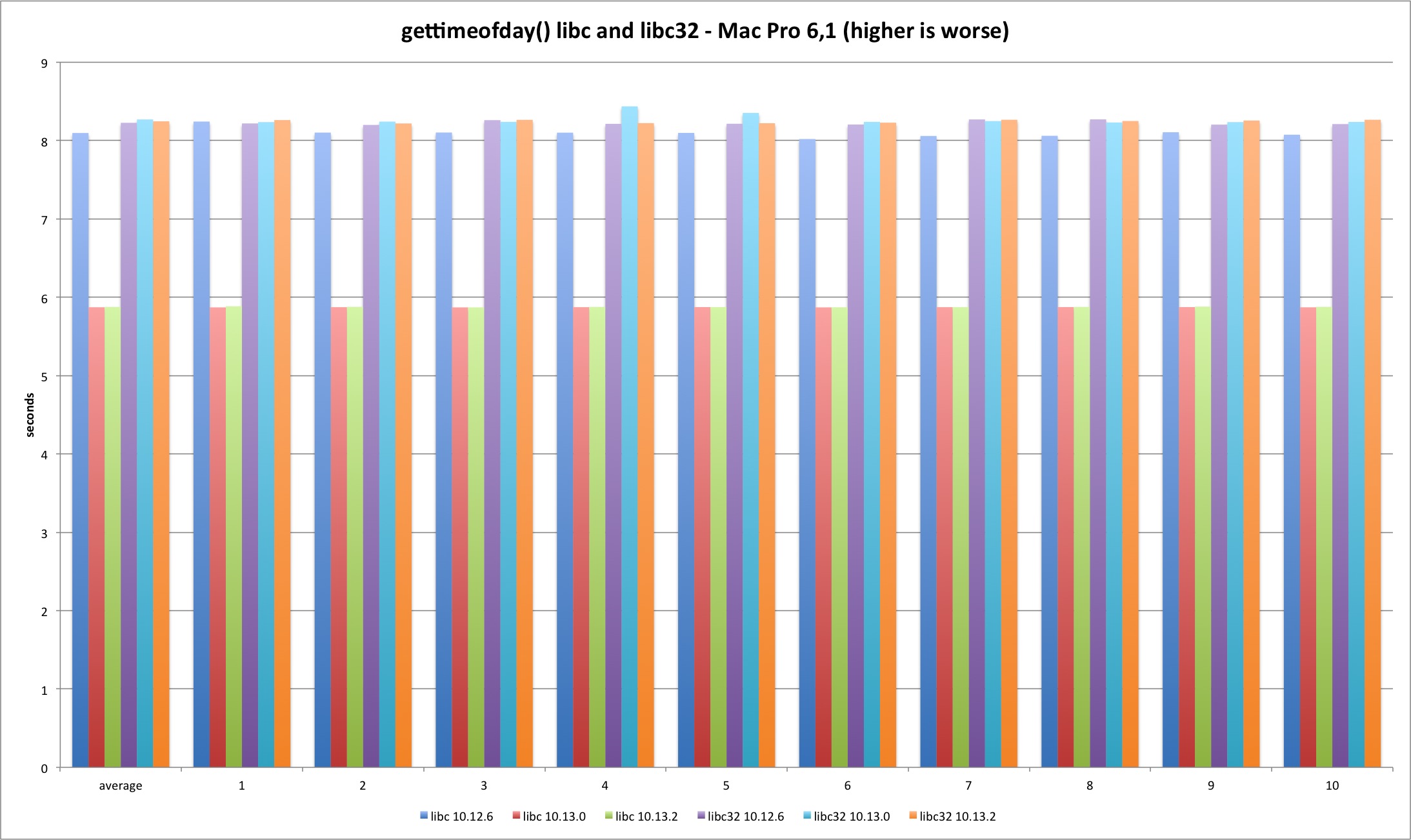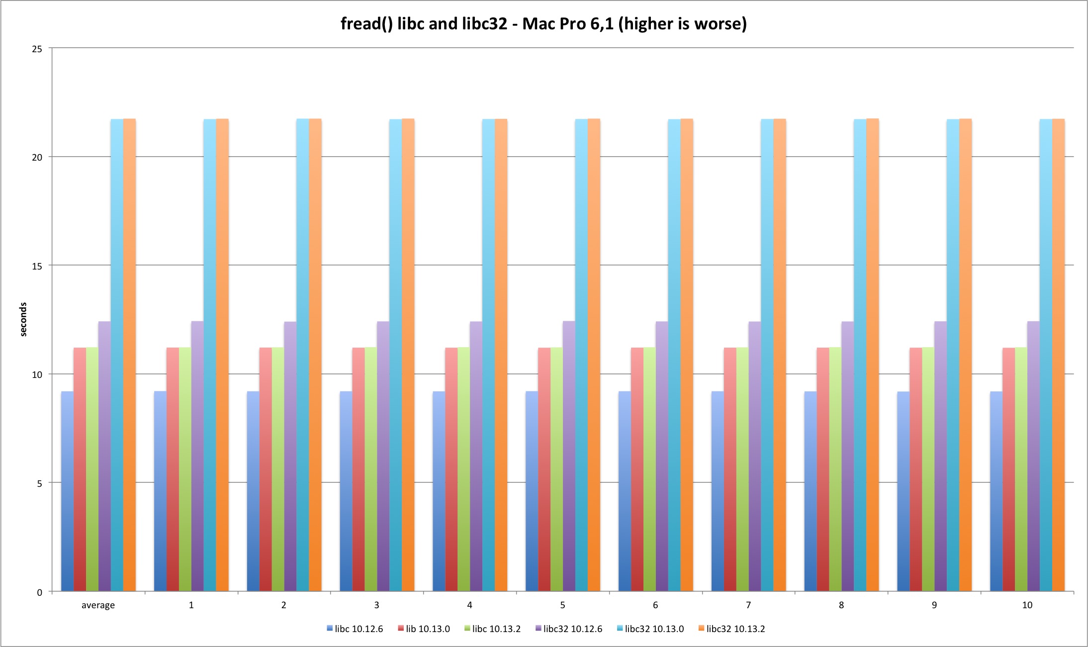 For the lseek test I decided to do two SEEK_SET per test, one 4 bytes ahead and then reset back to zero. The pattern holds and 10.13.2 test times are much longer, more than 200%. The difference is smaller in 32 bits because it was already 50% slower than 64 bit and syscall versions.